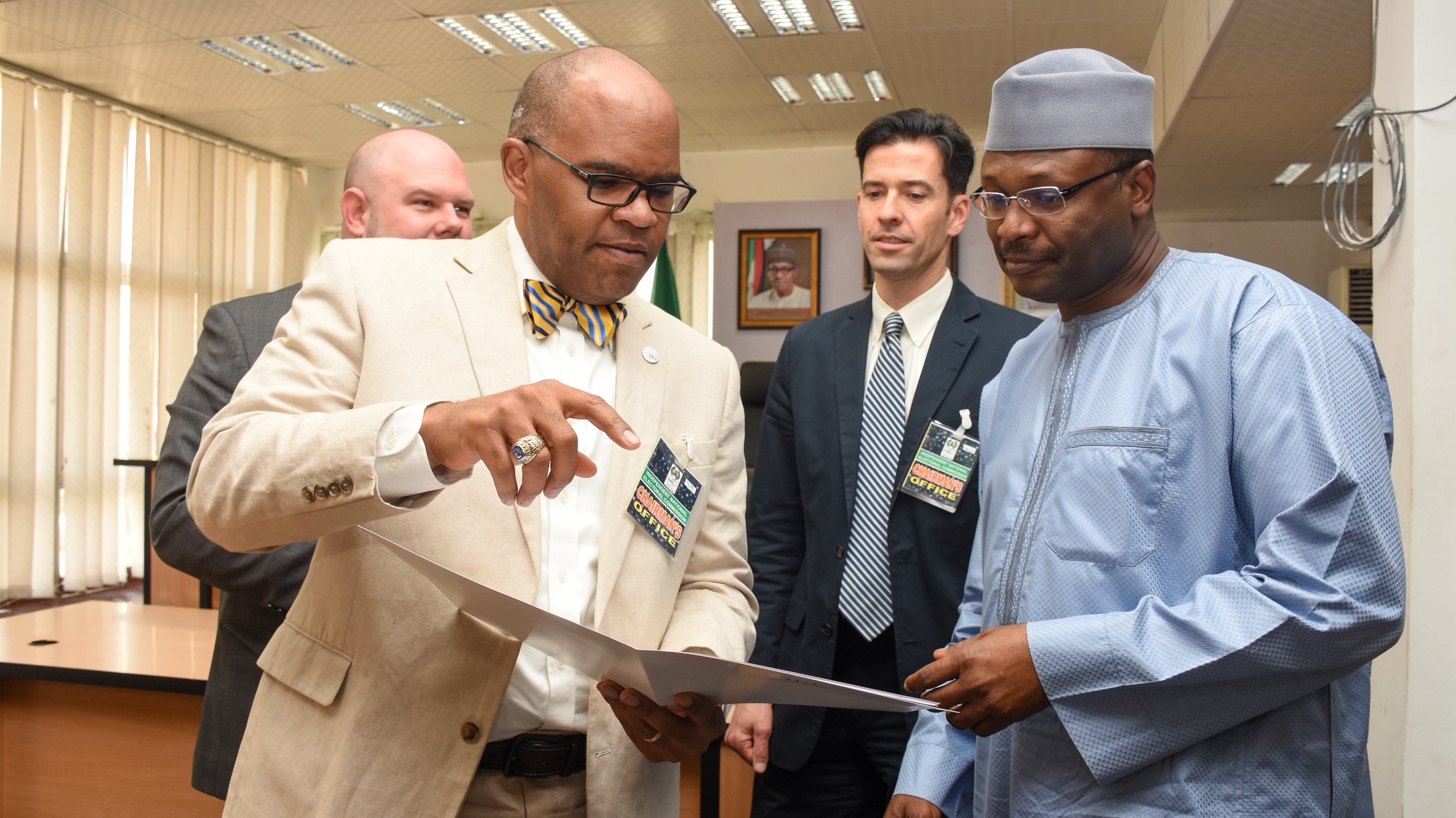 Meeting the Chairman of the electoral management body (INEC) in 2018. With the president of IRI (center) and my former Africa Director (over my shoulder)